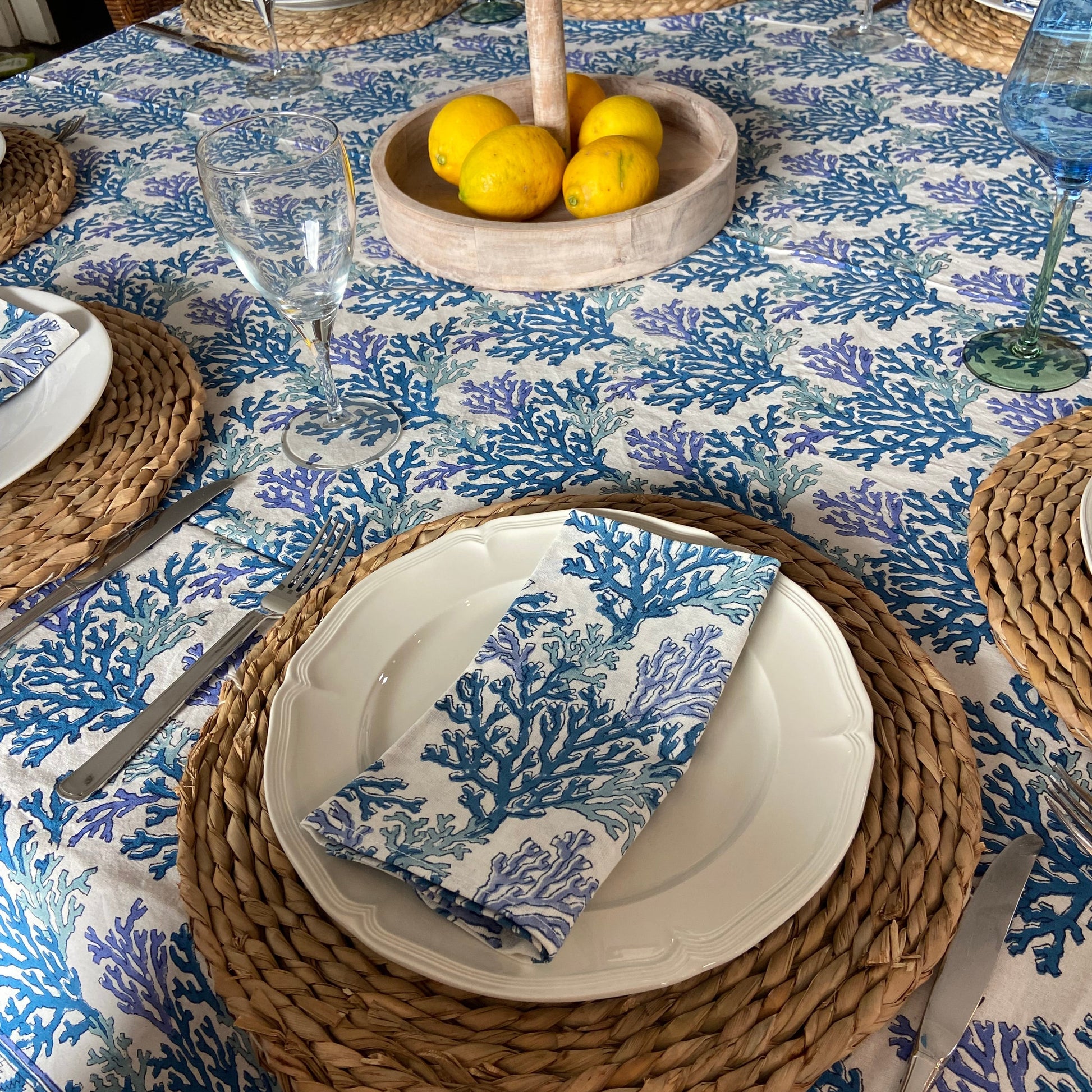 Block Printed Cotton Table Cloth Blue coral (180cm x 340cm)