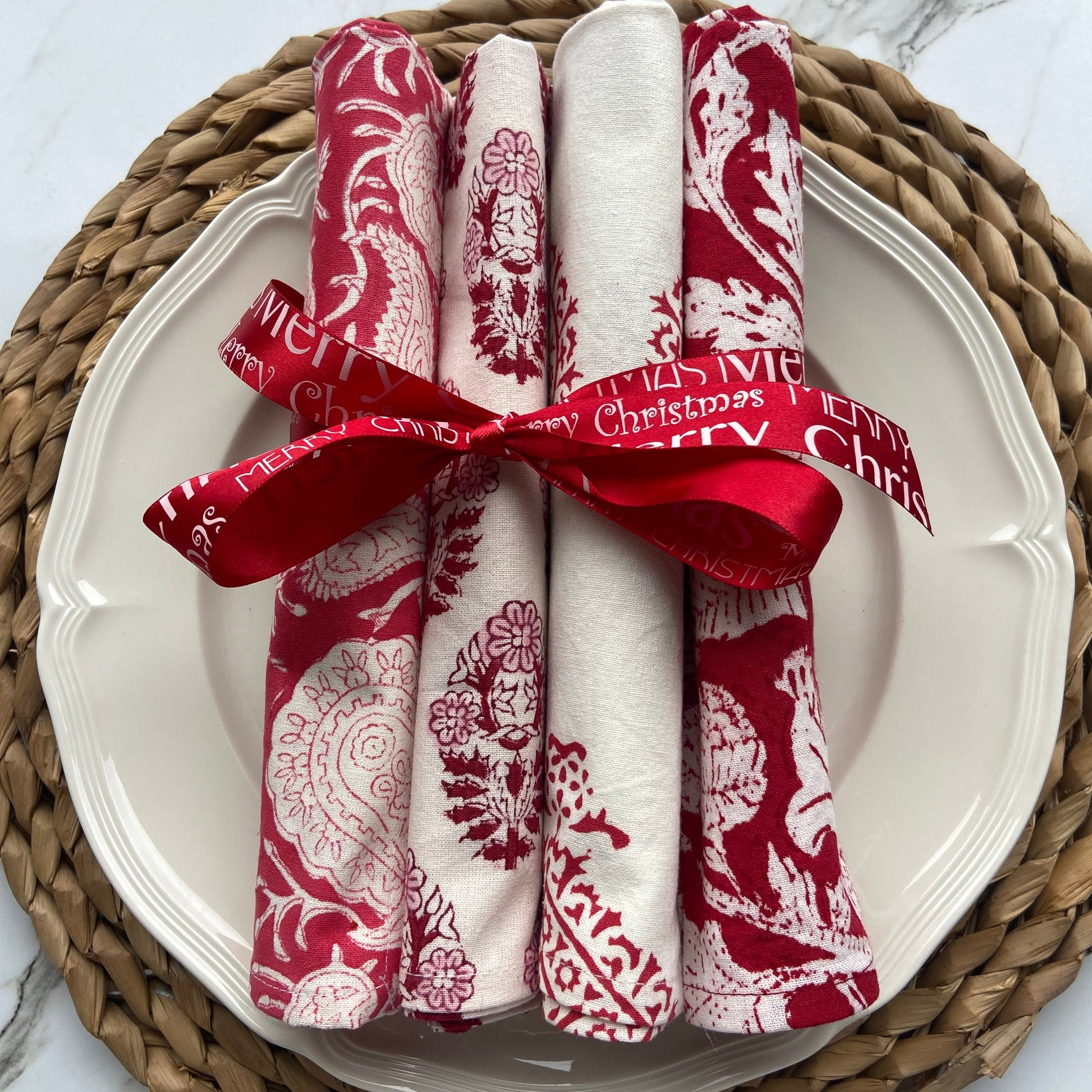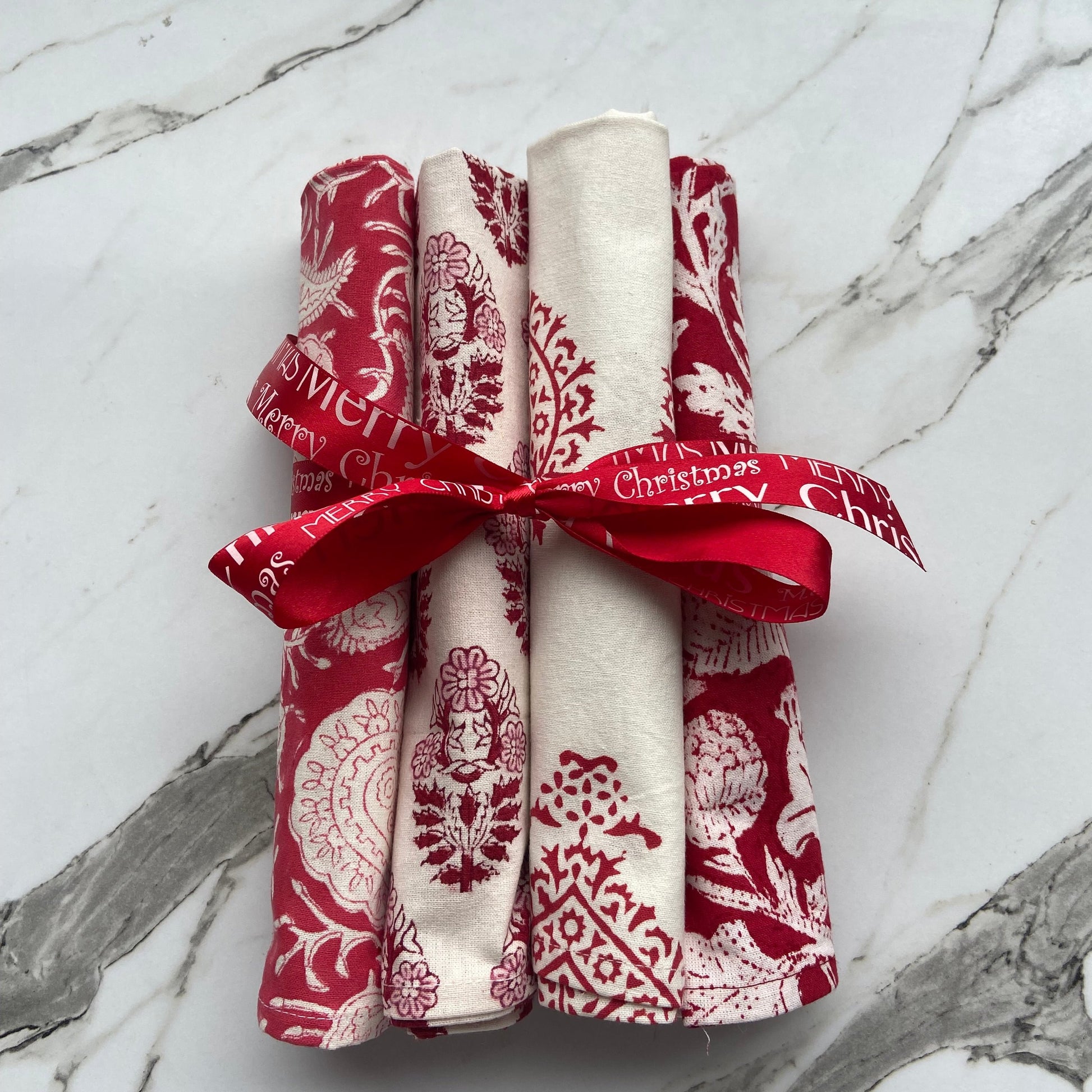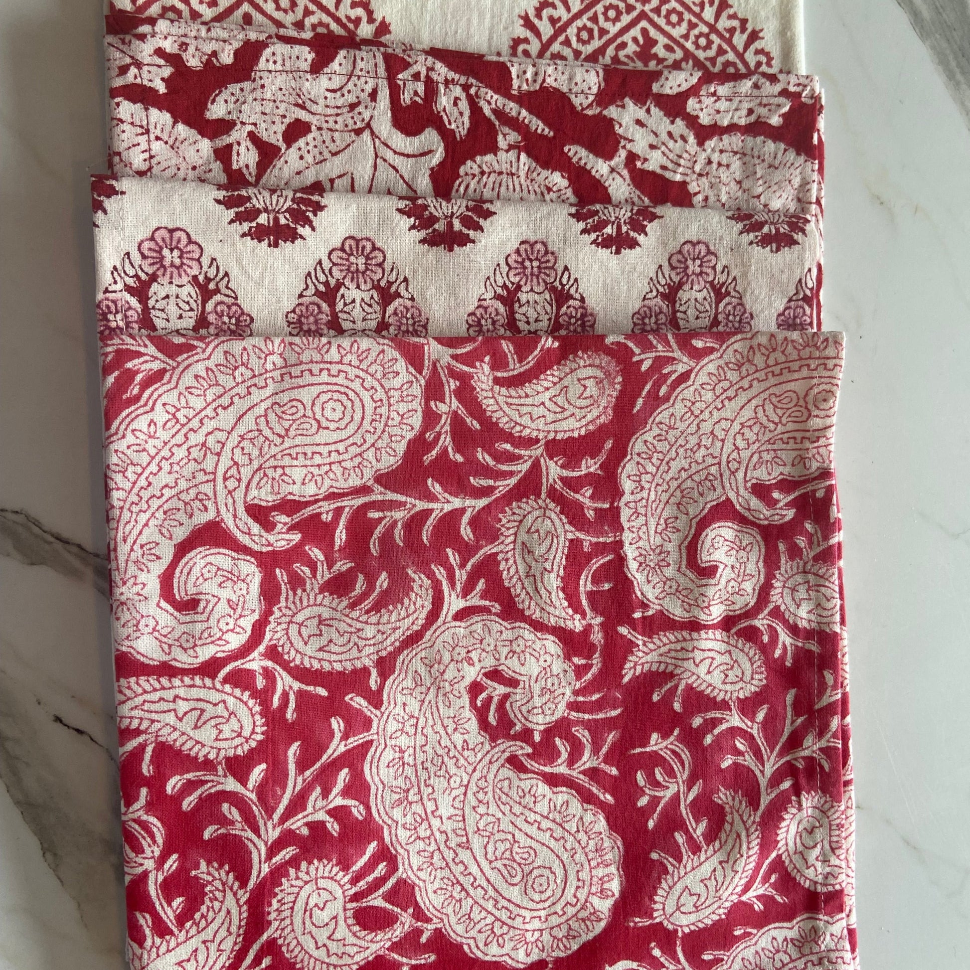 Block Printed Cotton Napkin Festive red, white and raspberry