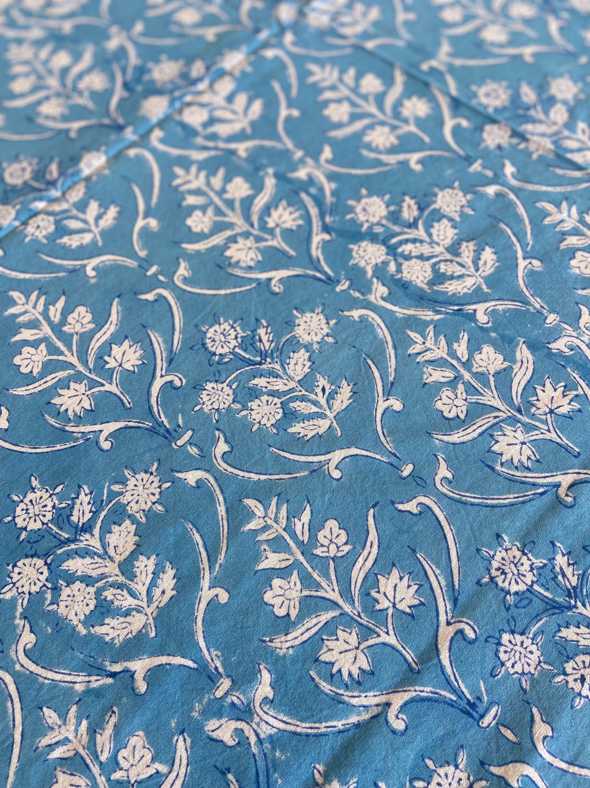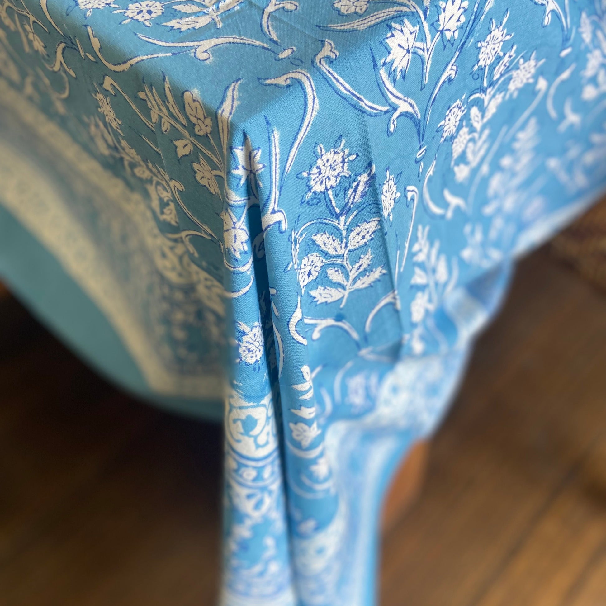 Block Printed Cotton Table Cloth Blue Vine Leaf Alaskan (180cm x 270cm)