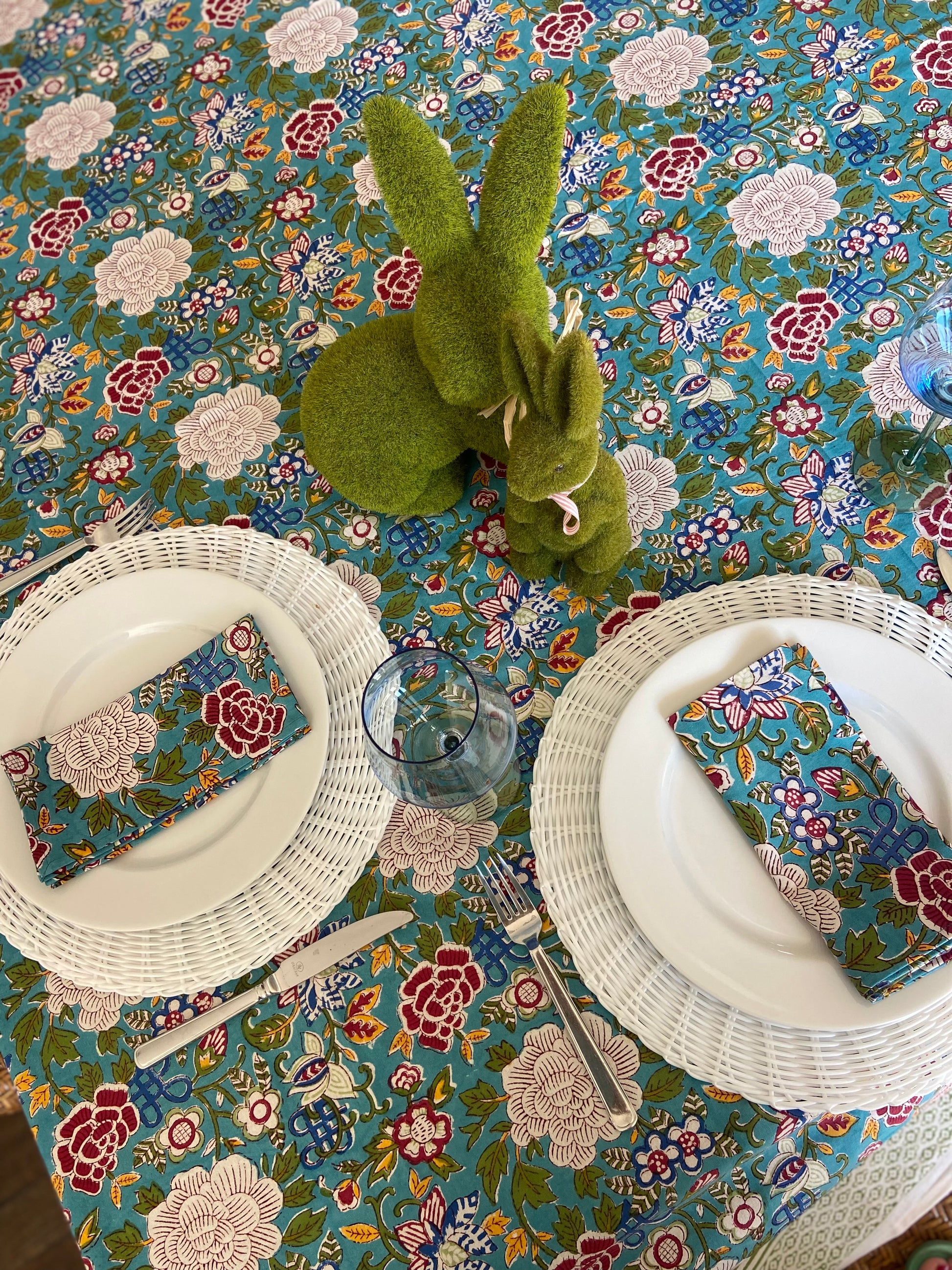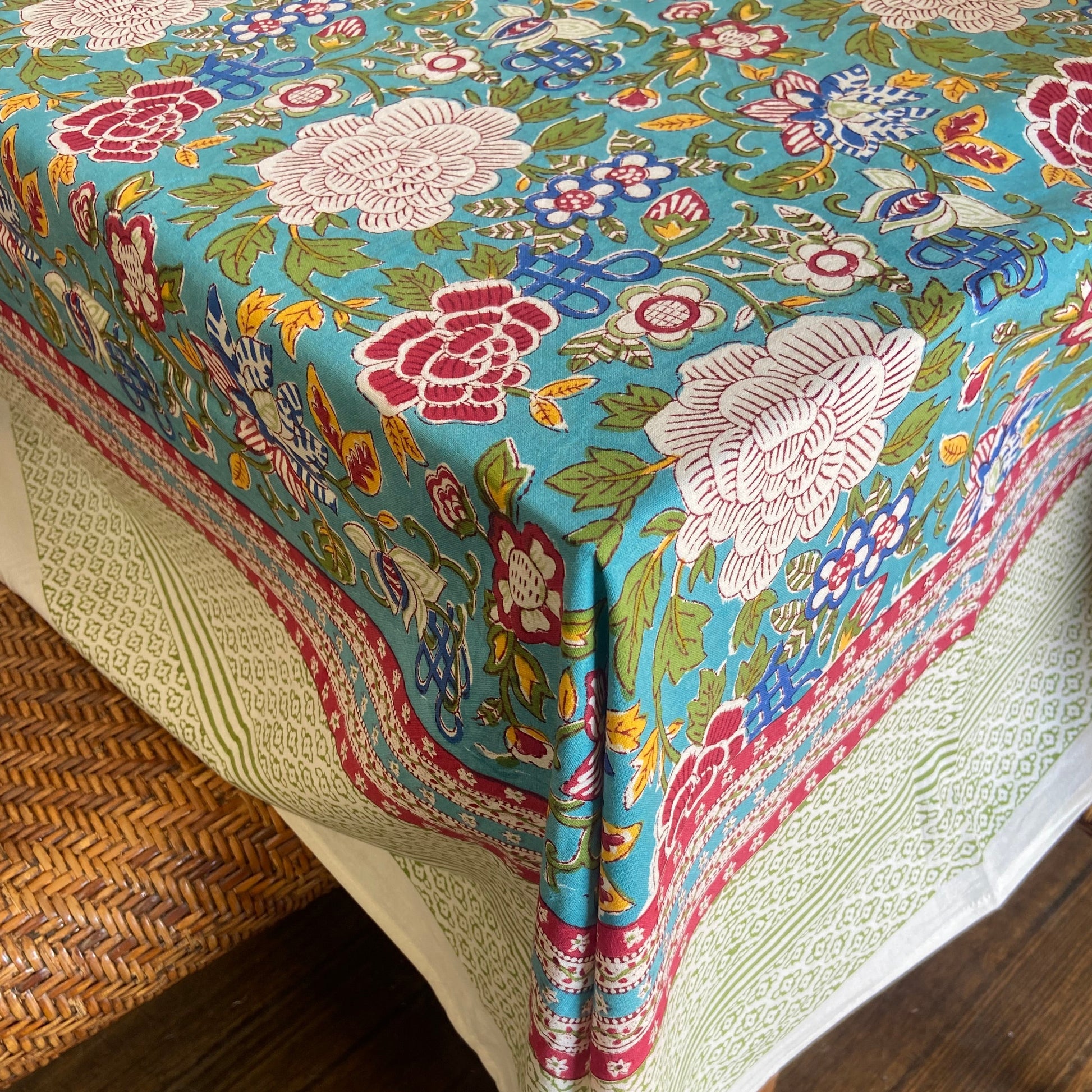 Block Printed Cotton Table Cloth Floral Canvas Blue Jade (220cm x 220cm)