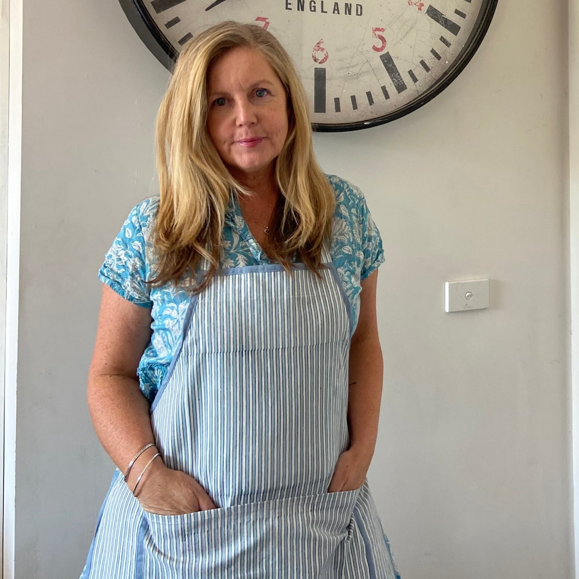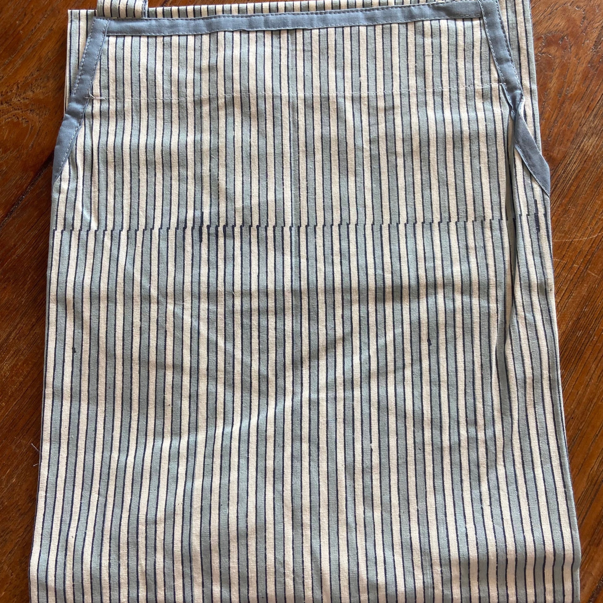 Apron Pinstripe Blue and Grey Block Printed Cotton