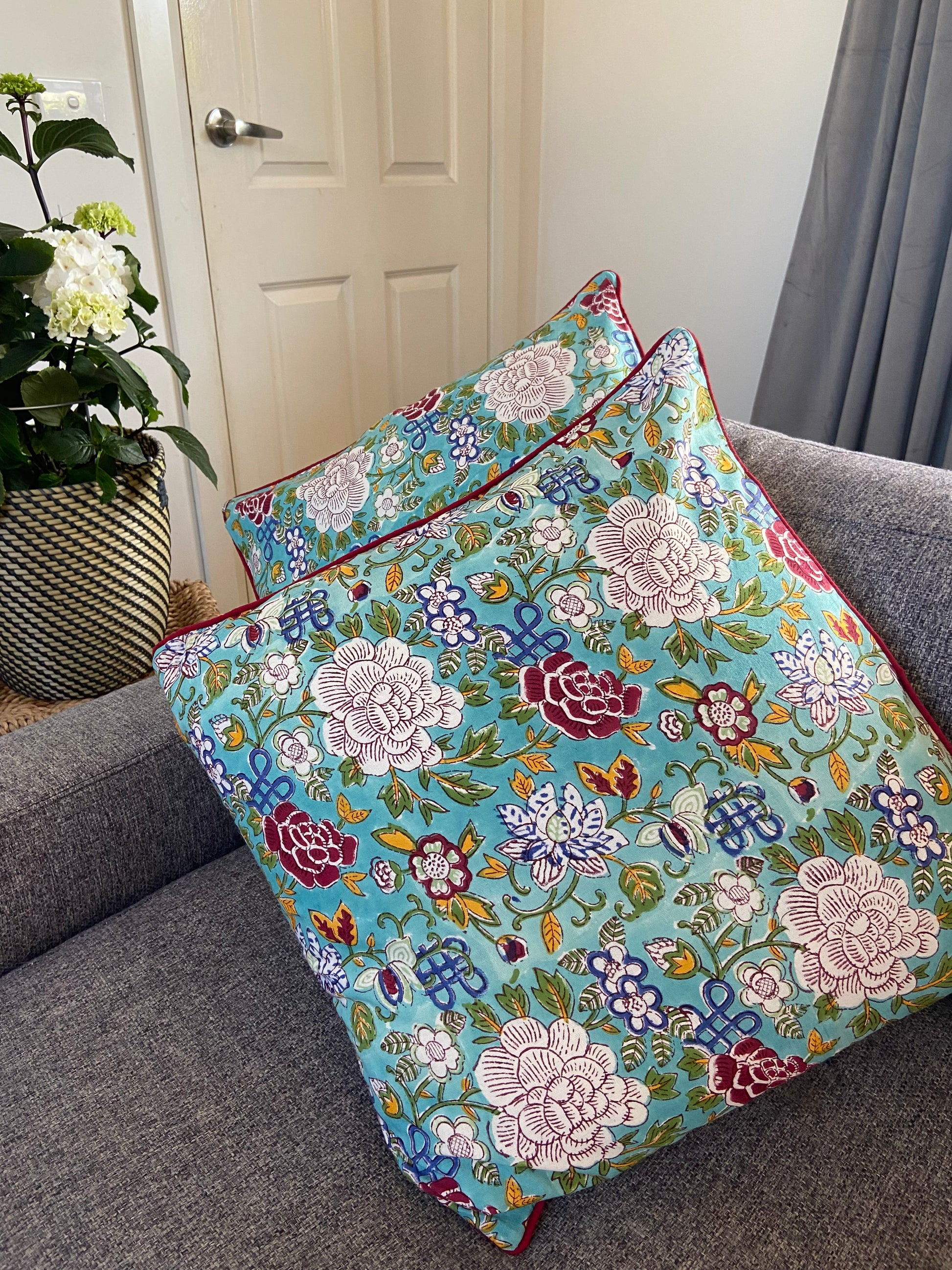 Floral Canvas Blue Jade Piping Cushions Covers (50X 50cm)