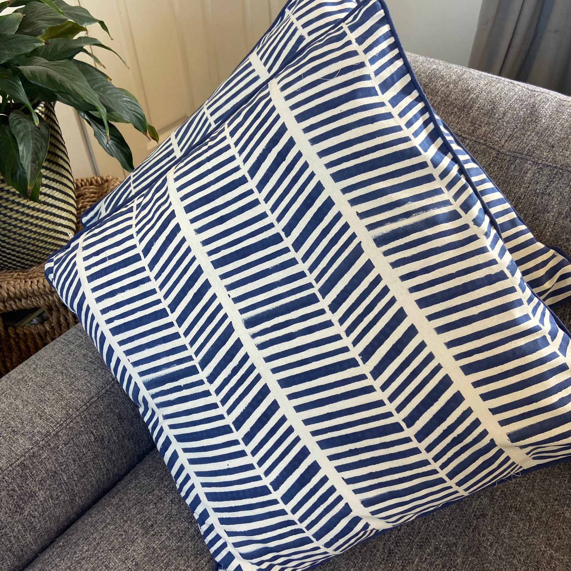 Piping Cushion Cover in 100% Cotton 20 Sheeting Fabric made by Hand Block Printing method. Each fabric is hand printed and later stitched into square pillows.