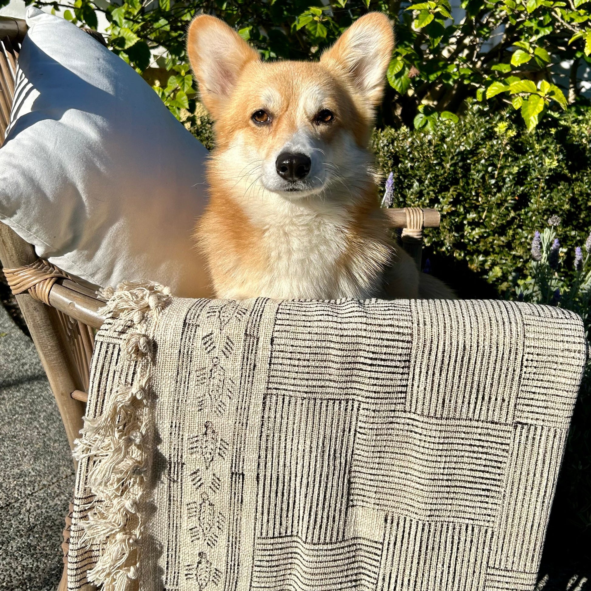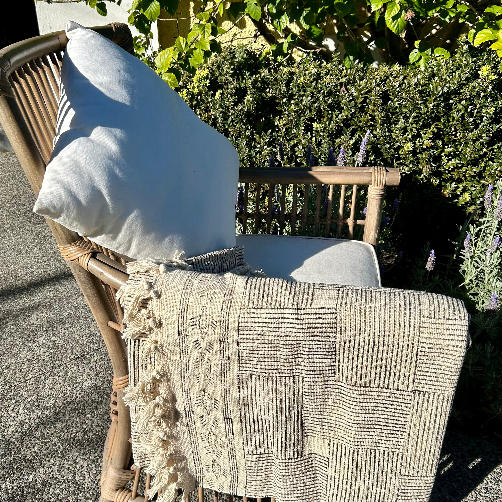 Cotton throw with hand block patterns, each piece is unique. The throw is made from slub cotton which is known for its absorbent qualities and soft texture. The size of the throw is 125cm X 175cm which is ideal for sofa, bed of lounge chair. It features decorative fringe tassels providing a perfect finish to the overall look. Fabric colour is neutral with black decorative patterns.