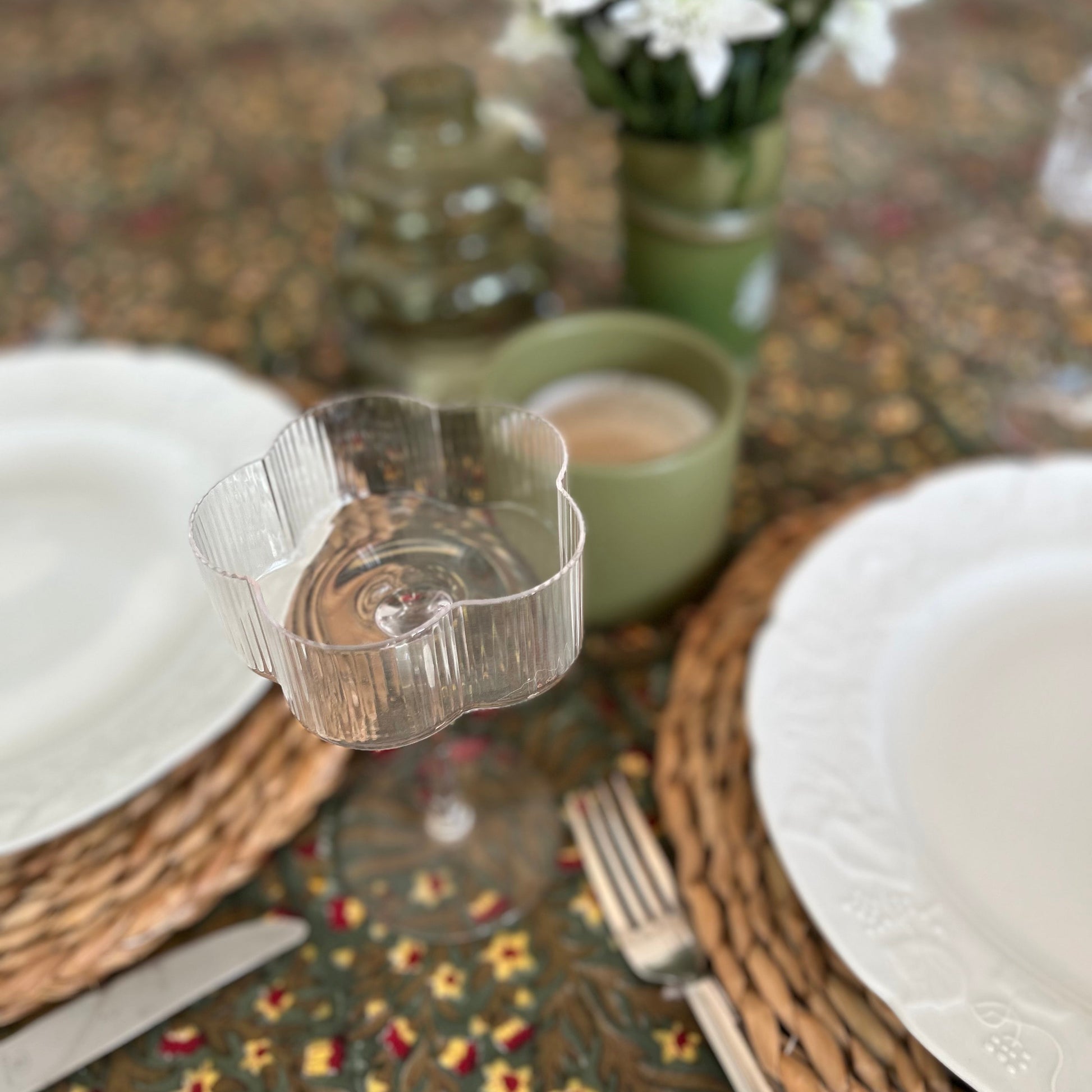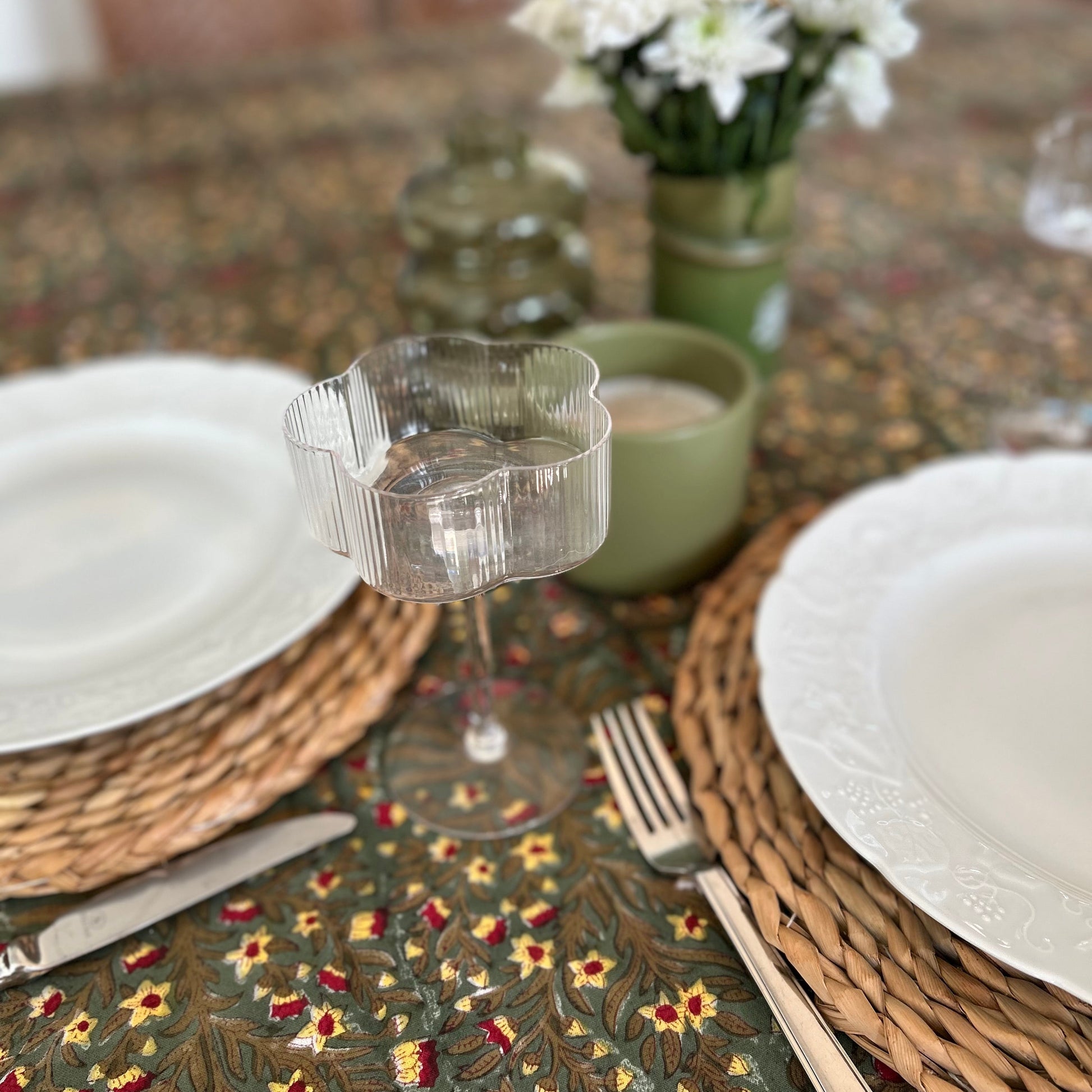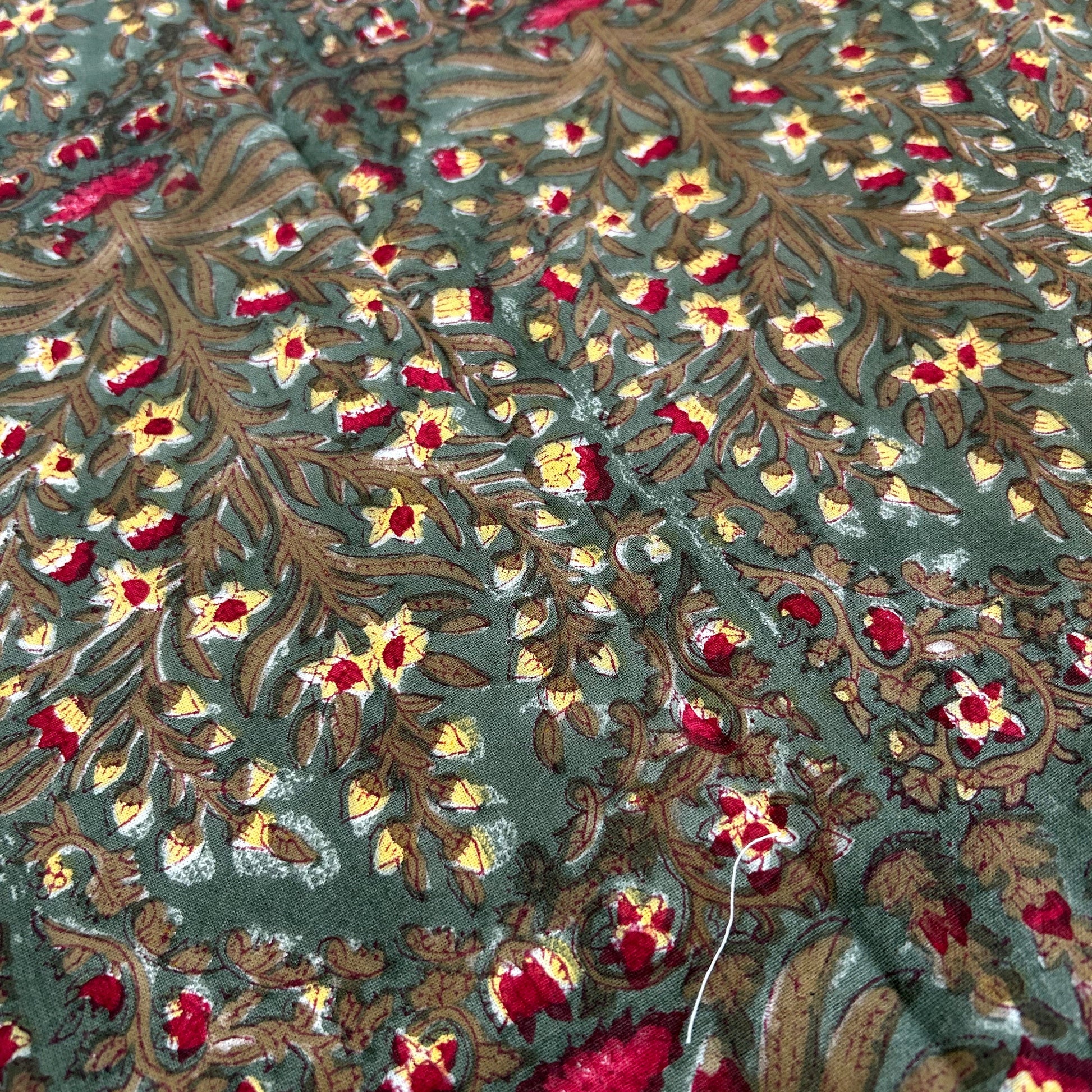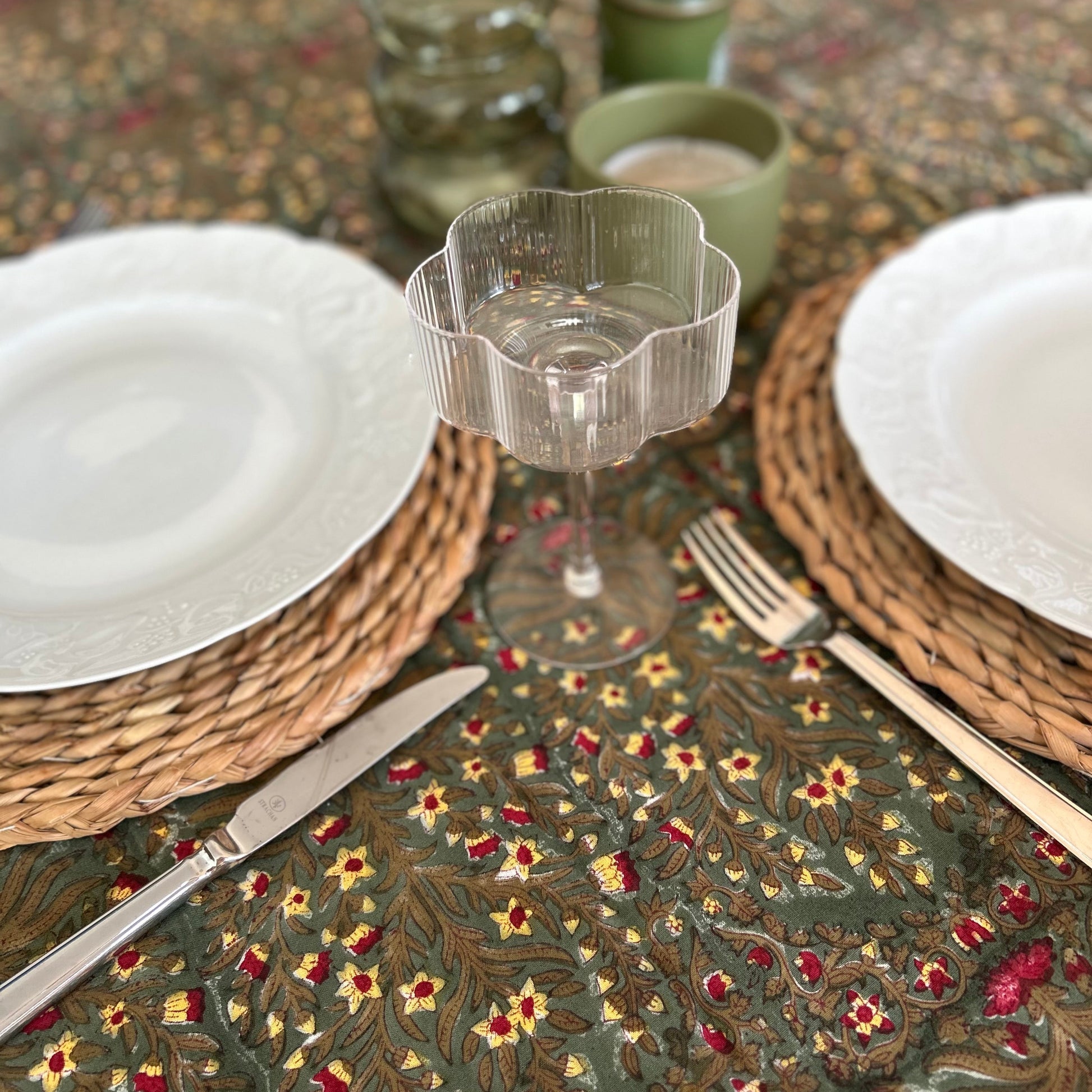 Floral tablecloth in olive green, red, white and yellow on canvas cotton fabric